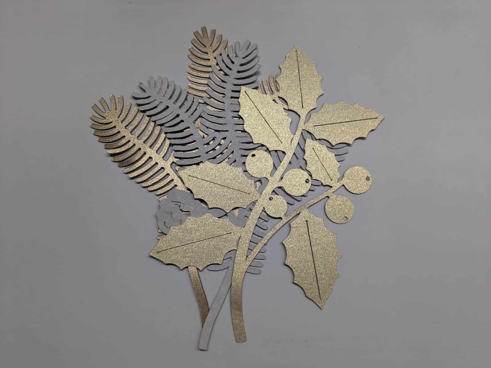 Sono dei Paper Cut di rametti tipici delle piante Natalizie: Pungitopo, Vischio e il Pino con la sua piccola pigna.